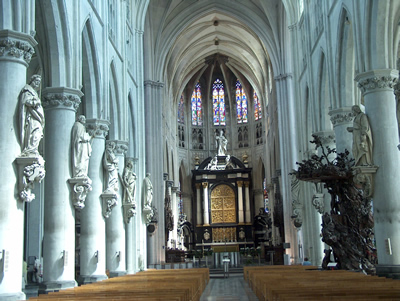 Dit gotische meesterwerk is een mooi voorbeeld van de Brabantse gotiek. Kenmerkend voor de Brabantse gotiek zijn de ronde zuilen die bekroond worden door koolbladkapitelen en maaswerk dat over zwikken, bovenlichten en triforium loopt. De massieve toren boven de hoofdingang is eveneens typerend voor de Brabantse gotiek. De kerk is gebouwd ter ere van de Heilige Rombout, een zevende-eeuwse Ierse missionaris die in Mechelen werkzaam was. Zijn stoffelijke resten zouden zich bevinden in de kathedraal. In het koor illustreren 25 laatgotische schilderijen ( 15 e en 16 e eeuw) het leven van deze martelaar.