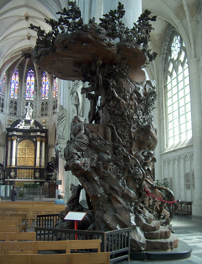houten preekstoel, gebeeldhouwd in 1721-23 door Michiel Vervoort.